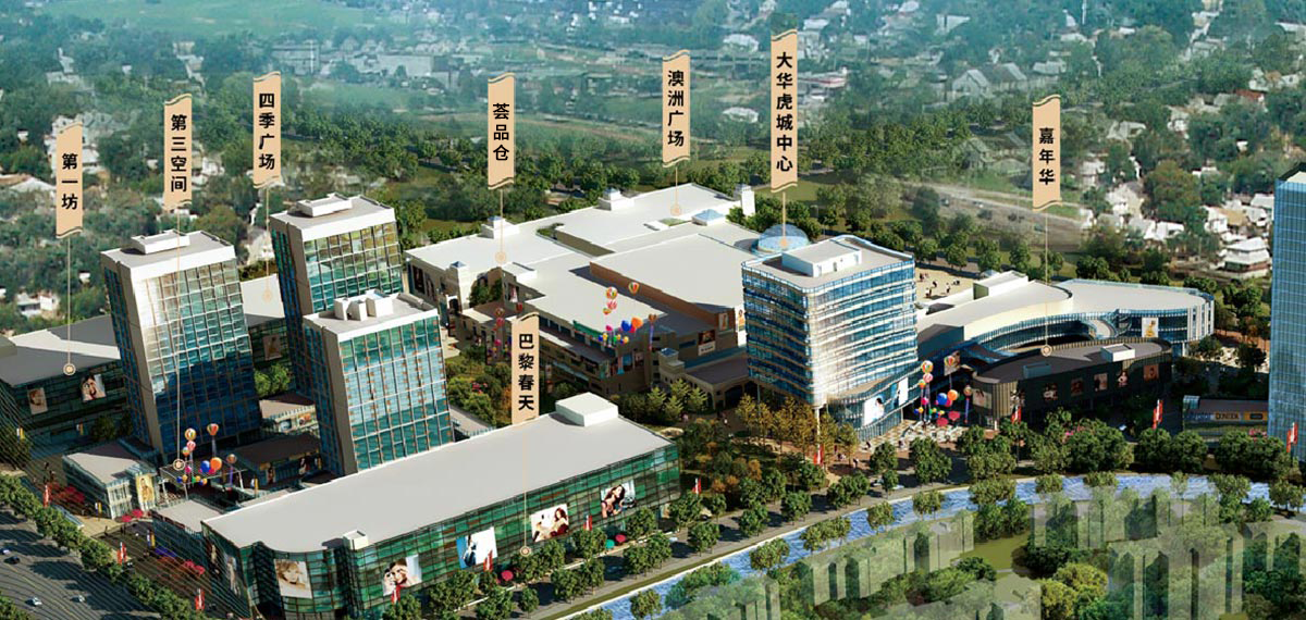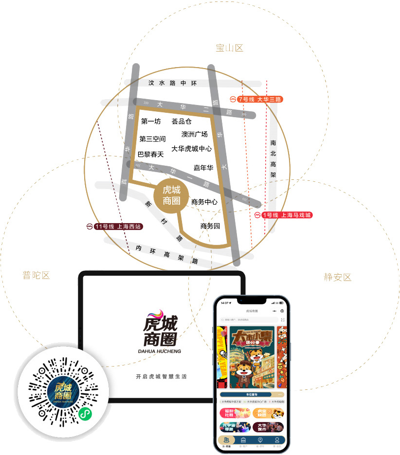 大华虎城商圈是上海申新(集团)有限公司旗下的大型社区商业综合体,地处宝山、普陀、静安三区交界处,商业建筑面积40万平方米,拥有1800个停车位,包括嘉年华、巴黎春天、第三空间、第一坊、四季广场、荟品仓、大华虎城中心、澳洲广场、商务中心、商务园10个商业项目,涵盖餐饮、娱乐、休闲、亲子、教育、零售、健身、丽人、旅游、金融、社区、房产12大业态,入驻商户逾千家。覆盖周边50万居住人口,商圈周围配套三十多条公交线路以及轨道交通7号线、11号线,是集区域性商业中心、社区商业中心、居民区商业中心于一体的特大型商业综合体。